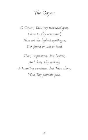 The Gayan O Gayan, Thou my treasured gem, I bow to Thy command, Thou art the highest apothegm, E'er found on sea or land. Thou, inspiration, dost bestow, And deep, Thy melody, A haunting sweetness dost Thou show, With Thy pathetic plea. 10